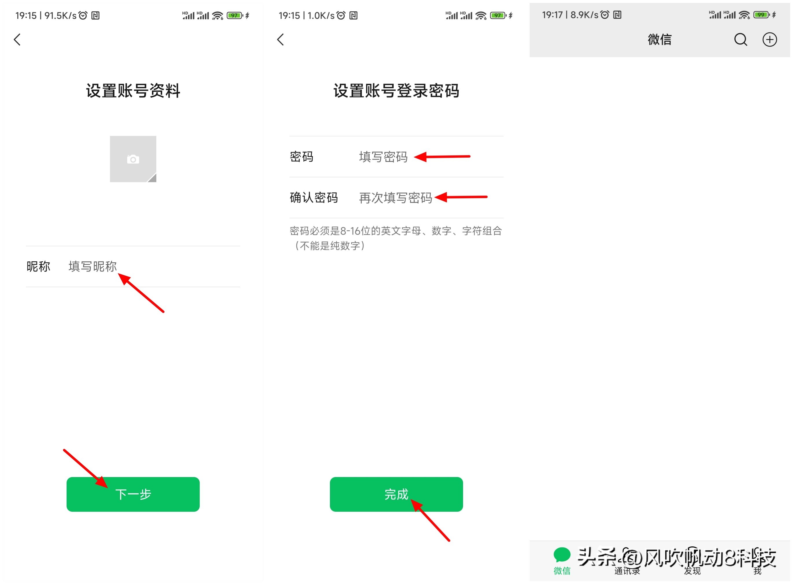 在设置账号资料界面,输入昵称,选择轻点【下一步】。输入要设置的密码,再次输入密码,最后轻点【完成】,这样就实现不使用手机号注册微信成功。