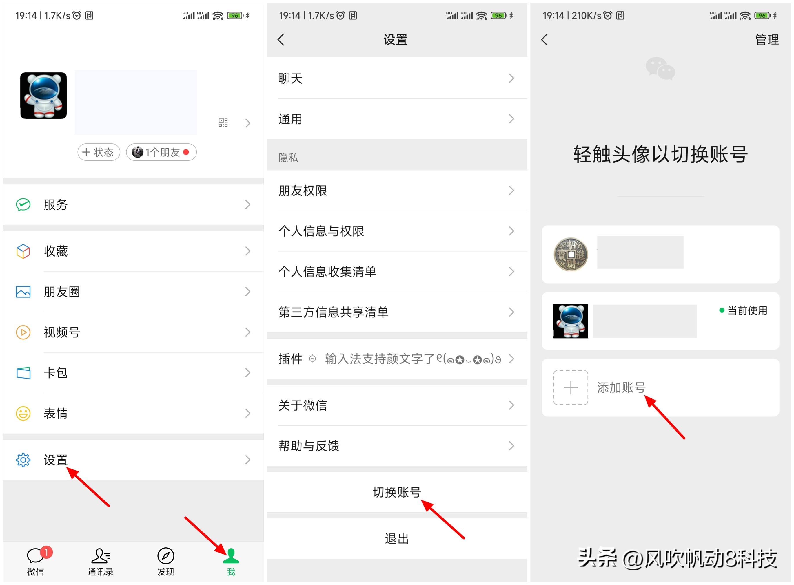 打开现在使用的微信,轻点【我】。接着在我界面中,选择单击【设置】。转换界面后,单击【切换账号】。接着在切换账号界面,选择轻点【添加账号】。