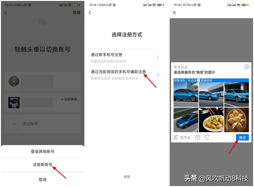 展开新界面,轻点【注册新微信】。进入后,可以看到“通过新手机号注册”和“通过当前微信的手机号辅助注册”,想要不使用手机号注册,就需要轻点【通过当前微信的手机号辅助注册】。在安全验证界面中,滑动滑块完成拼图,接着选择轻点【确定】。