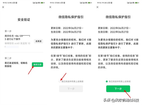 完成发送后回到微信,轻点【继续注册】。勾选【我已阅读并同意上述条款】,接着选择轻点【下一步】。
