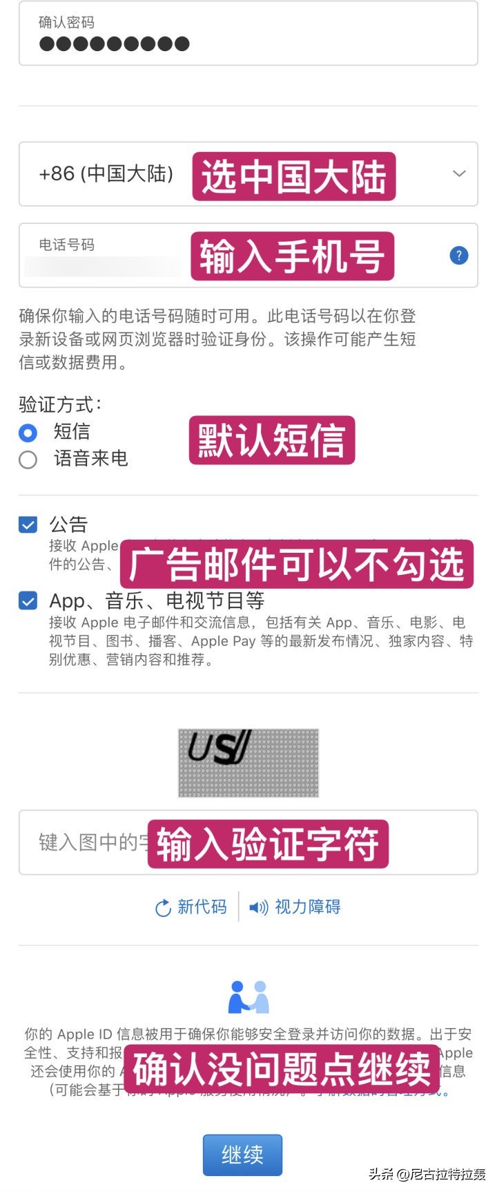 输入英文名字、姓氏,国家选美国,出生日期要大于18岁,全新的邮箱,手机选中国大陆,输入手机号即可(我注册两个号用同一个手机也OK),验证方式默认短信,广告可以不勾选,确认无误点继续。