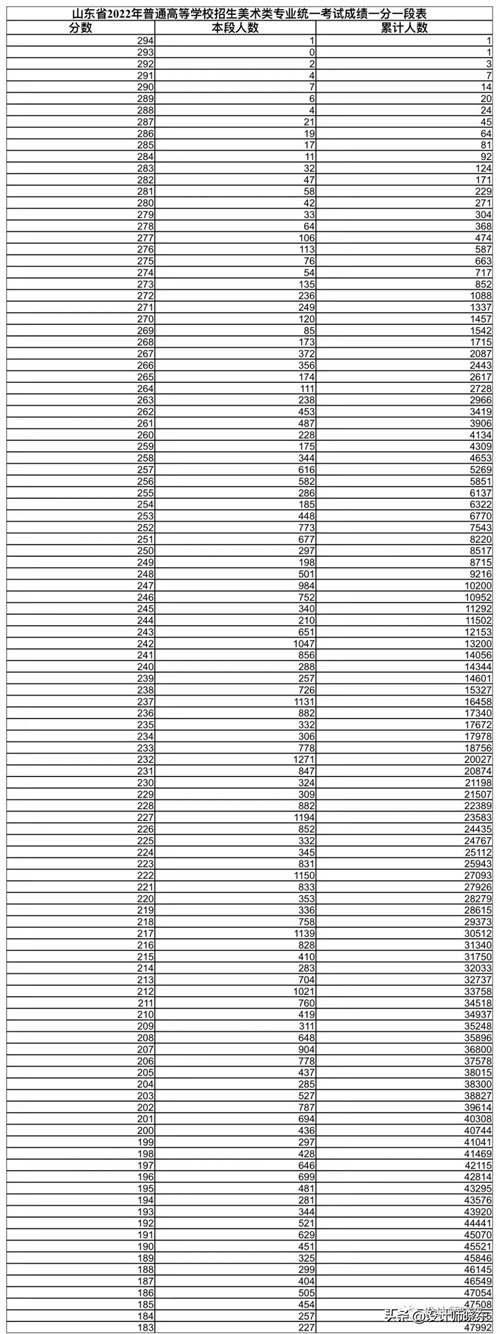 2022年,山东的初选联考分数线为266.33分。从下面2022山东美术专业统考成绩一分一段线来看,2022年,整个山东省达到美术类专科线以上的考生总共约48000人,大于等于267分的只有2087人,约4%。