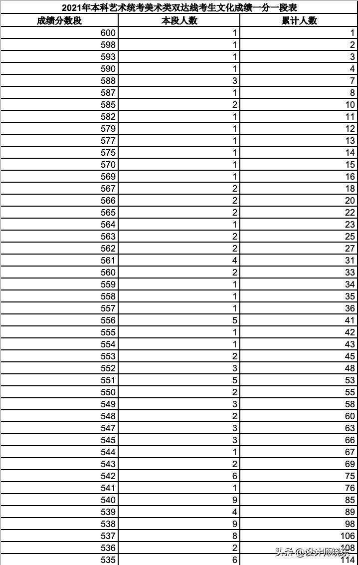 专业课成绩比较高的同学,高考文化课成绩需要考到535分左右,而专业分最低的同学,文化课成绩需要达到568分左右。这个分数意味着什么呢?仍然以2021年为例,2021年,专业课和文化课双达线的人数总共24333人,文化课成绩大于等于535分的人数只有114人,而超过568分的仅有16人。