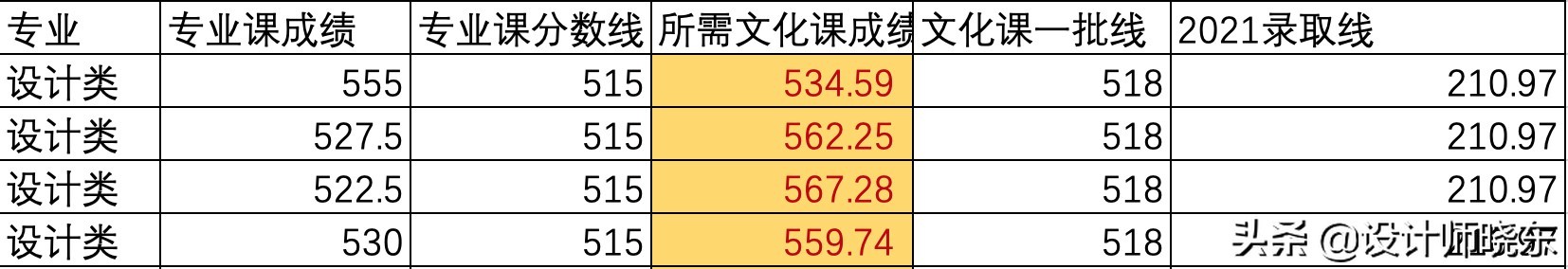 2021年,设计学类的录取综合成绩北京不低于219.04、其他省不低于210.97(综合成绩并列210.97的,专业课成绩不低于540分)根据去年的录取线简单计算一下: