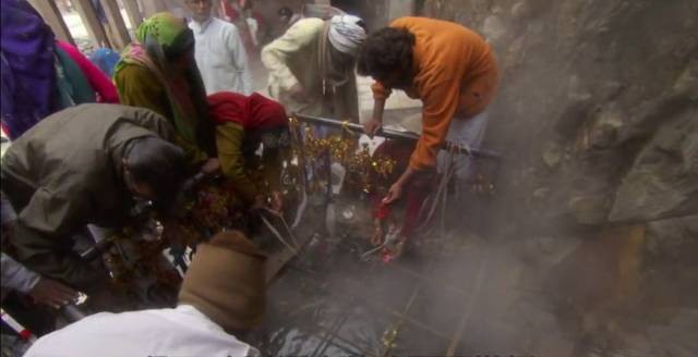 यमुनोत्री,恒河的第二个发源地,同时它也被认为是亚穆纳河的起点。信徒们在祭拜之前,会在寺庙下的一个温泉里沐浴,洗去身上和心灵的灰尘,以示他们的虔诚。在这里,他们将熟大米放入热腾腾的硫磺味的池子里来供奉河神。
