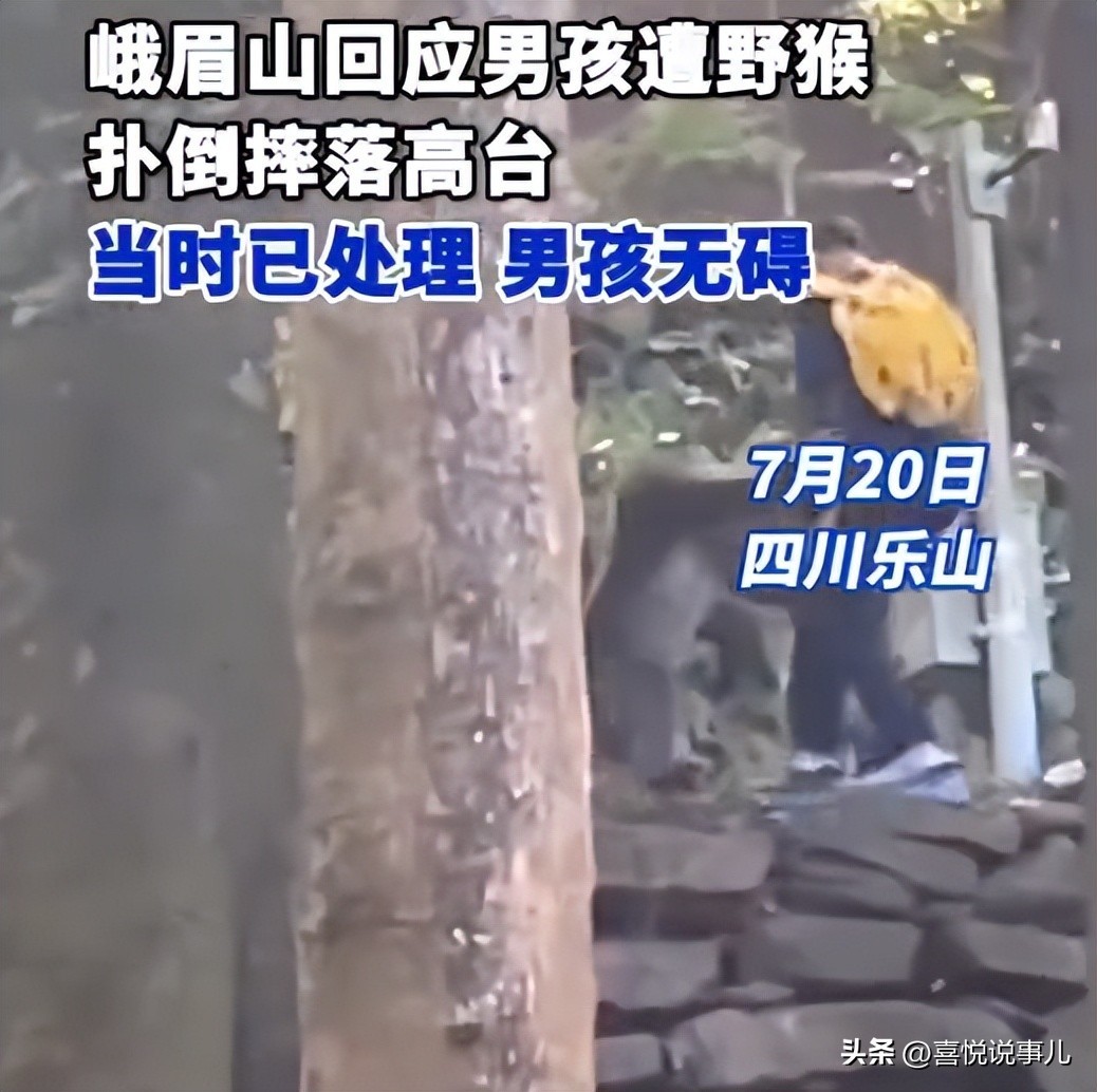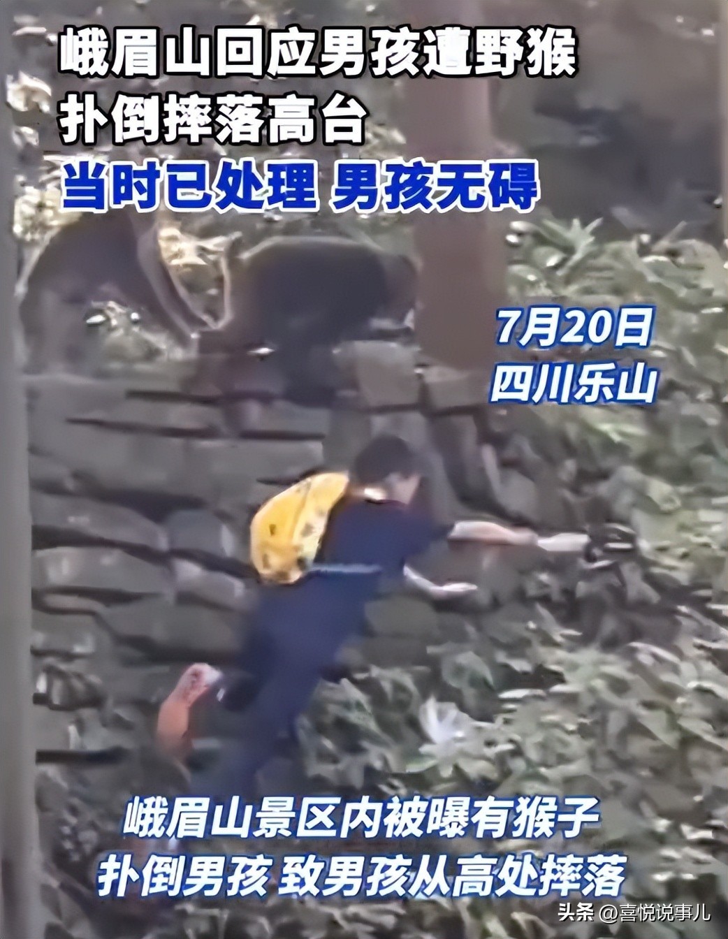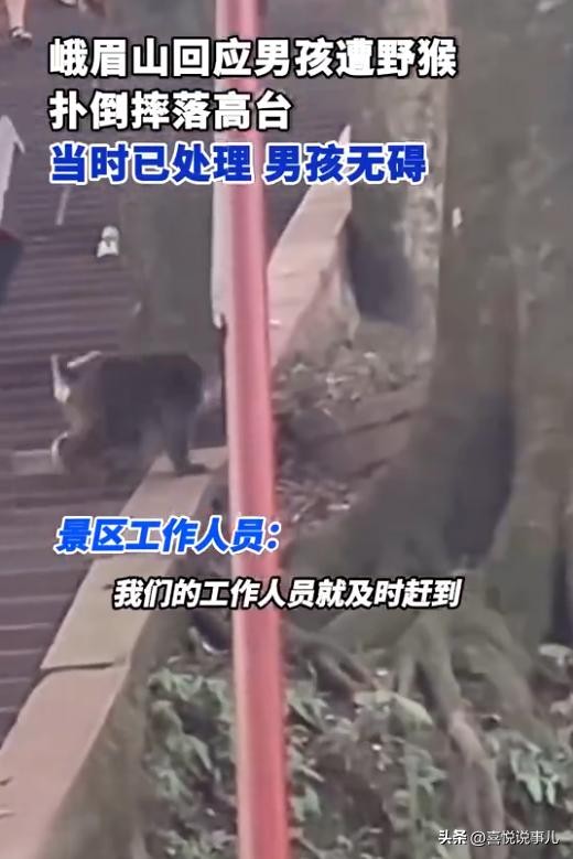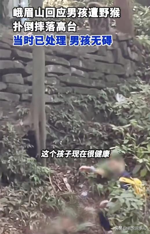 峨眉山野猴再次伤人,抢夺食物扑倒男孩,致其从高处摔落而下