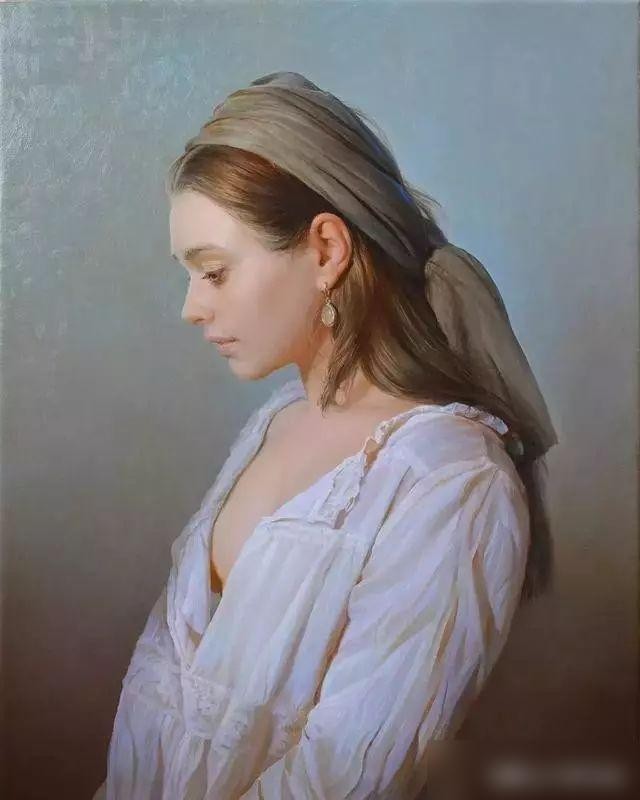 这幅油画中,少女的肌肤光滑细腻、眼睛亮晶晶的。