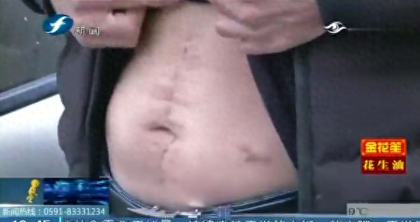 同时,李先生面对镜头展示了伤口,称事发后到警察局,他突然肚子痛,到医院后发现是肠子破裂,并做了手术。随后他报了警,要求赵宇对其进行赔偿。