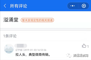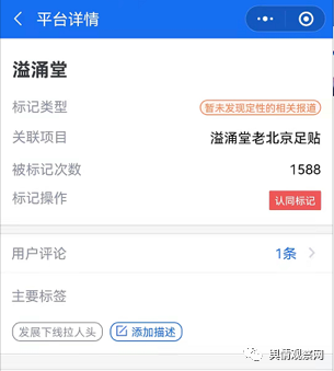 此外,溢涌堂的代理模式也备受媒体及网友质疑,在腾讯大数据灵鲲金融风险查询举报平台显示,溢涌堂被标记了1588次,主要标签为“发展下线拉人头”。其中某用户留言评论称,溢涌堂就是拉人头,典型的微商传销。