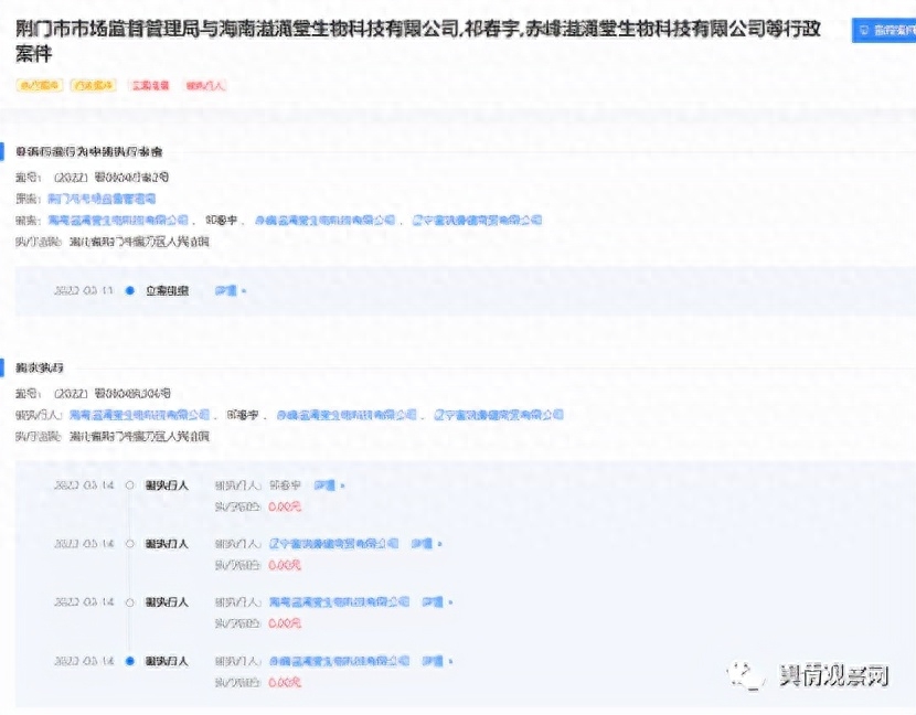 而也就在去年,前文所提到的赤峰溢涌堂生物科技有限公司与辽宁富饶康健商贸有限公司、海南溢涌堂生物科技有限公司及相关人员被荆门市市场监督管理局申请执行财产保全,荆门市中级人民法院经审理后裁定冻结了上述公司及人员的账户。