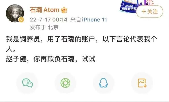 “我是饲养员,用了石璐的账户,以下言论代表我个人。赵子健,你再欺负石璐,试试。”