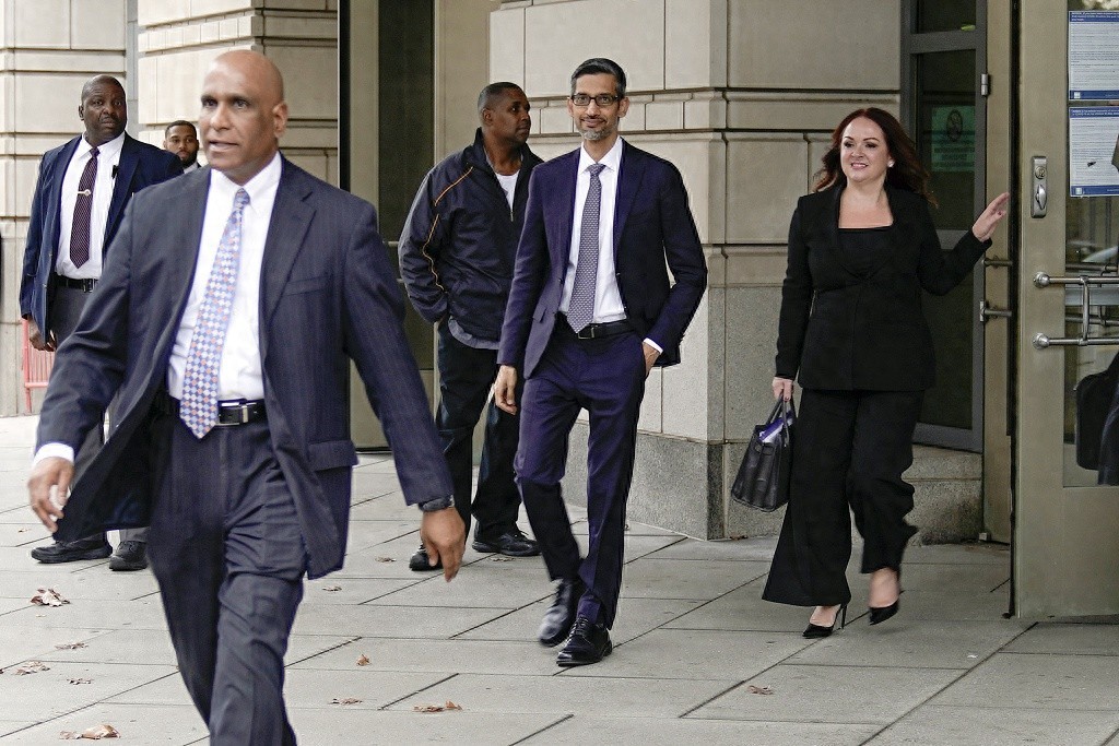 2023年10月,谷歌CEO(中)前往美司法部接受反垄断调查。(视觉中国)