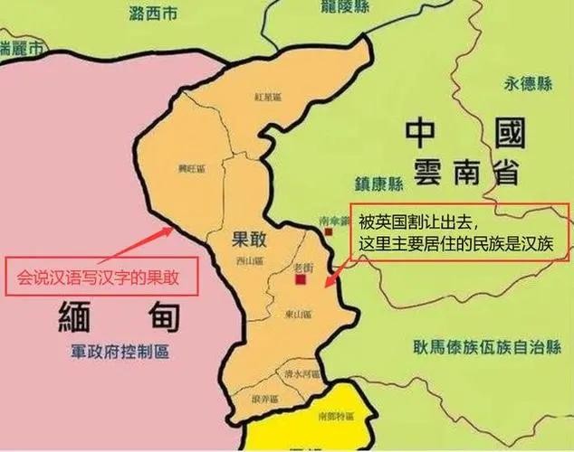 可没过多久,清廷又和英国签订了一个补充条约,这份条约将野人山东侧的地区和果敢地区又划给了缅甸,缅甸当局赶紧把果敢地区的汉族改称“果族”,当地人口中的汉语也被他们称为“果语”,但仍由杨氏一族统治果敢。实行民族自治政策