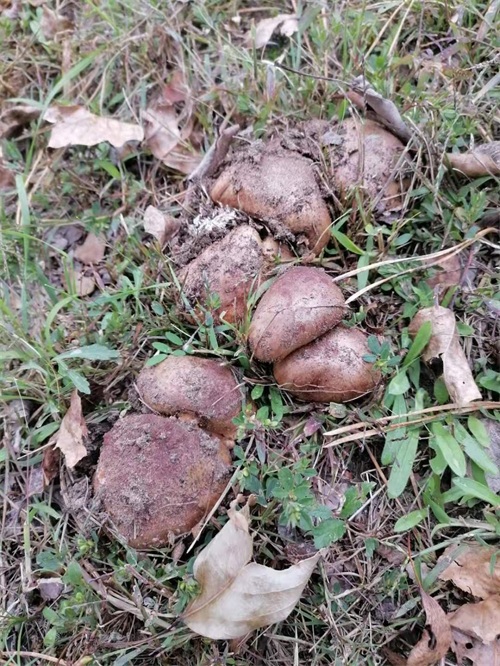 土豆蘑。这是最好吃的一种蘑菇,包饺子非常鲜美。也是隐藏最深的一种蘑菇,一般藏身于厚厚的落叶中,成片出现。多出现在针阔混交林。一般是深灰色,无论是颜色还是隐藏深的习性都非常像土豆,因此得名。图片中的土豆蘑因为露出头,接受阳光照射所以偏红。