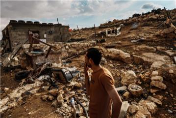 △当地时间 2025 年 11 月 15 日,约旦河西岸,一名巴勒斯坦人在检查被以色列定居者破坏的房屋和农田。