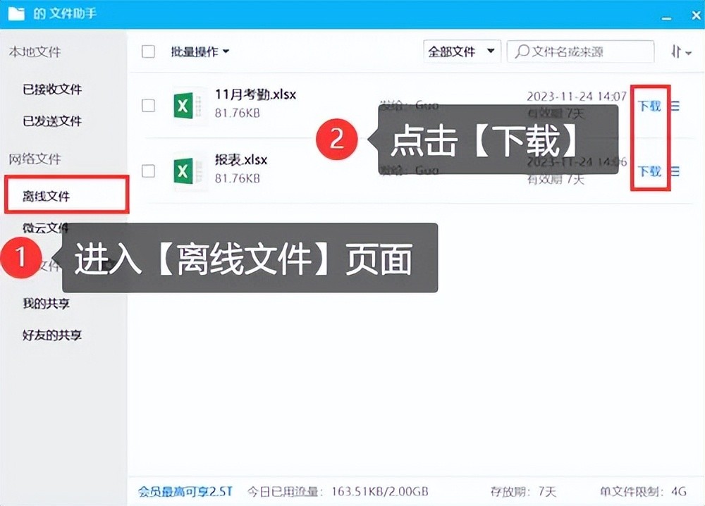 步骤1:登录QQ,打开电脑版文件助手,在左侧列表中选择【离线文件】选项卡。