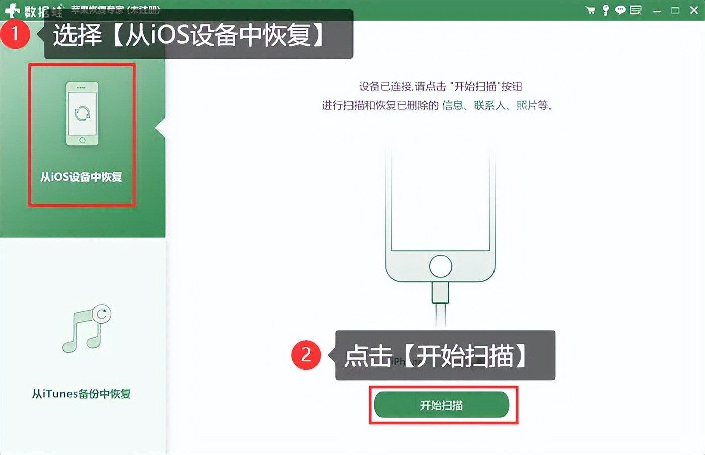 步骤3:在软件界面上选择相应的扫描方式【从iOS设备中恢复】,然后单击【开始扫描】,等待软件深度扫描您的设备。注意在扫描过程中,请确保设备与电脑的连接稳定。