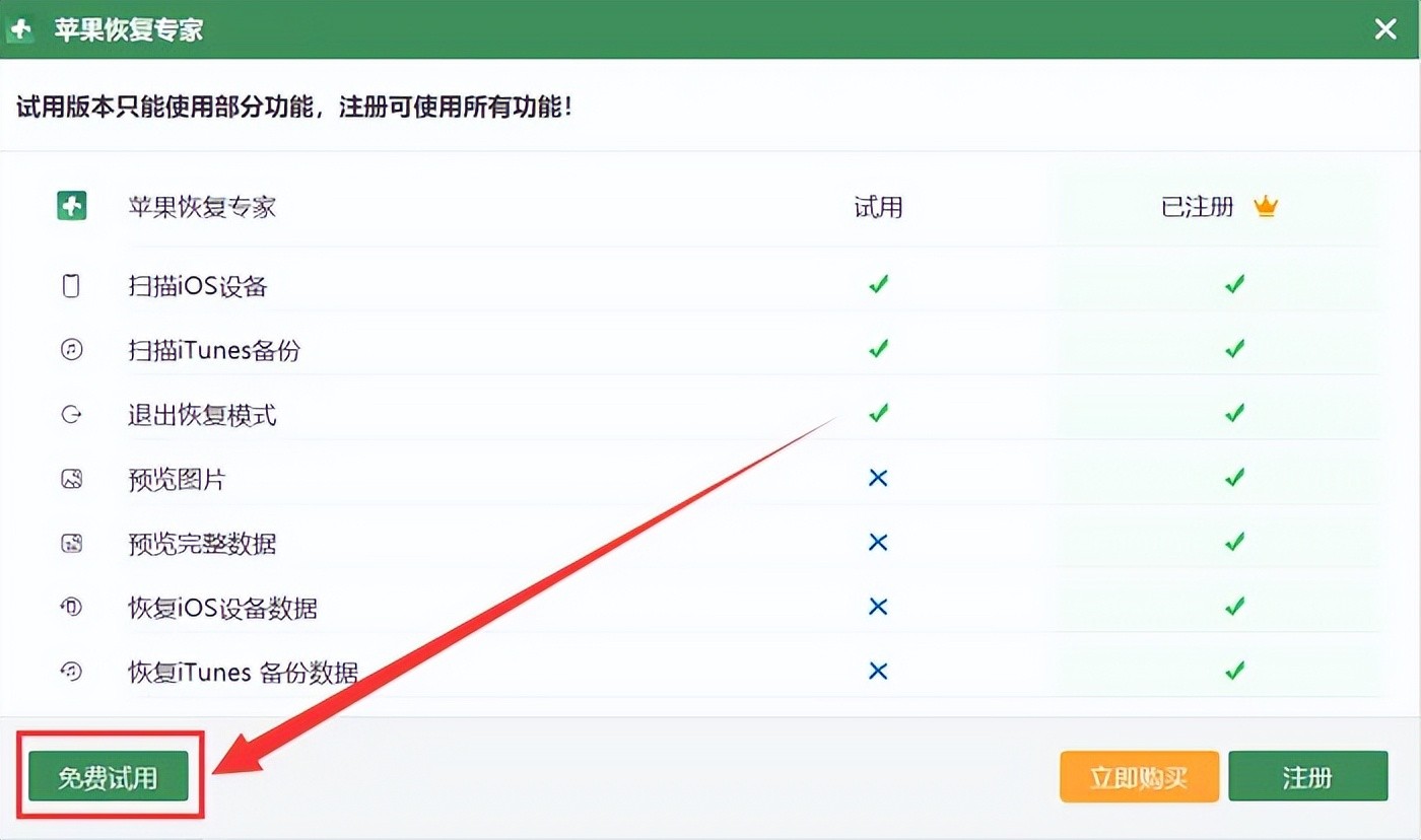 步骤2:连接您的设备至电脑,并启动软件,首次下载的用户建议选择【免费试用】版本。