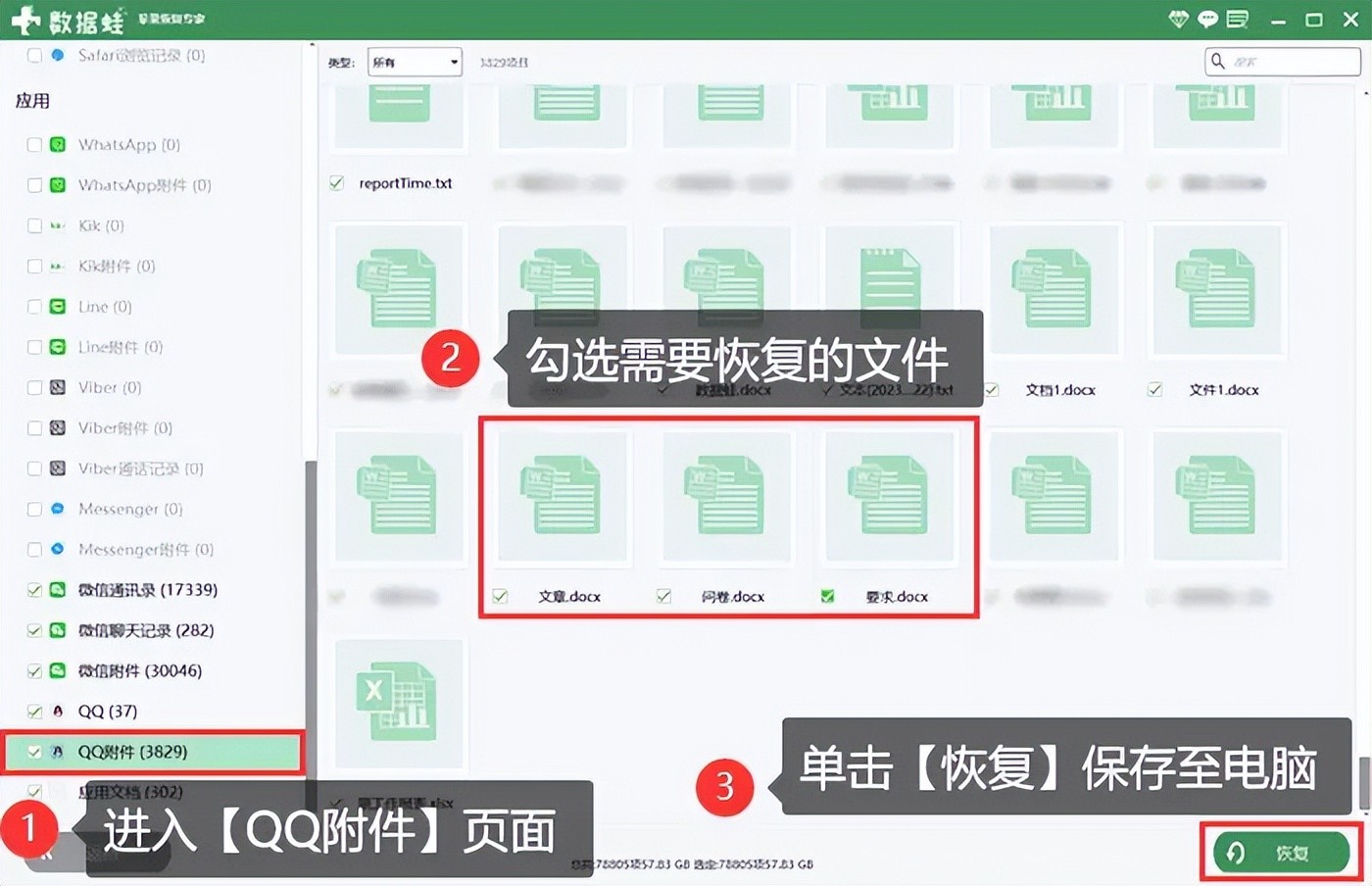 步骤4:扫描完成后,软件将展示可恢复的数据类型列表。在列表中选择【QQ附件】,勾选您需要恢复的文件。