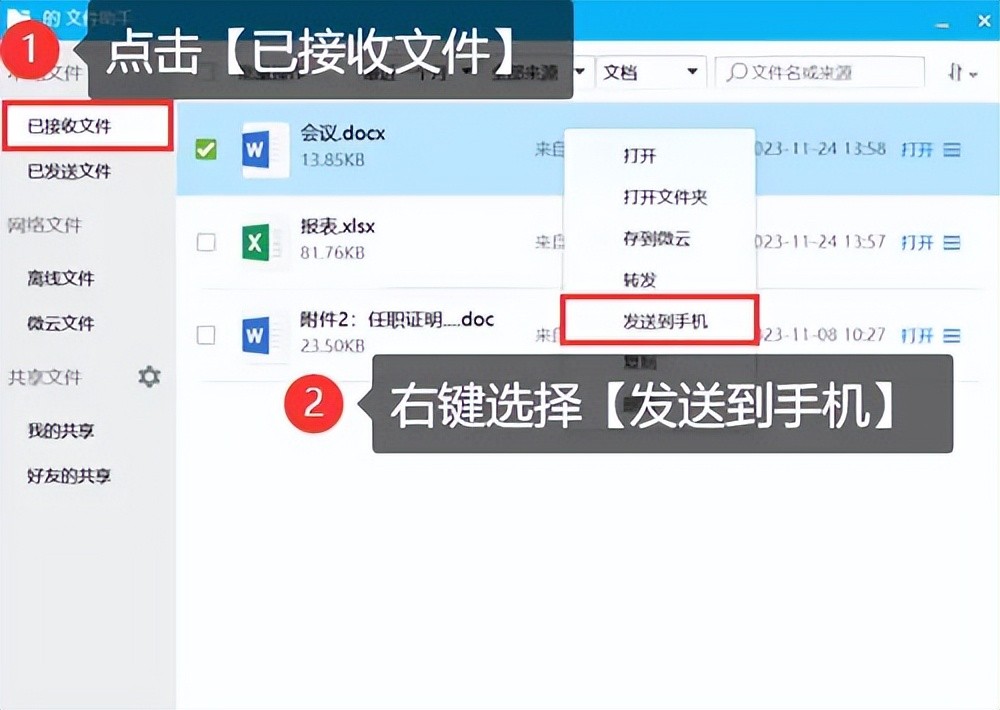 步骤3:选中想要恢复的文件,然后单击右键,在弹出窗口中点击【发送到手机】按钮即可将文件重新转发,或者直接点击【复制】将文件粘贴在电脑上。