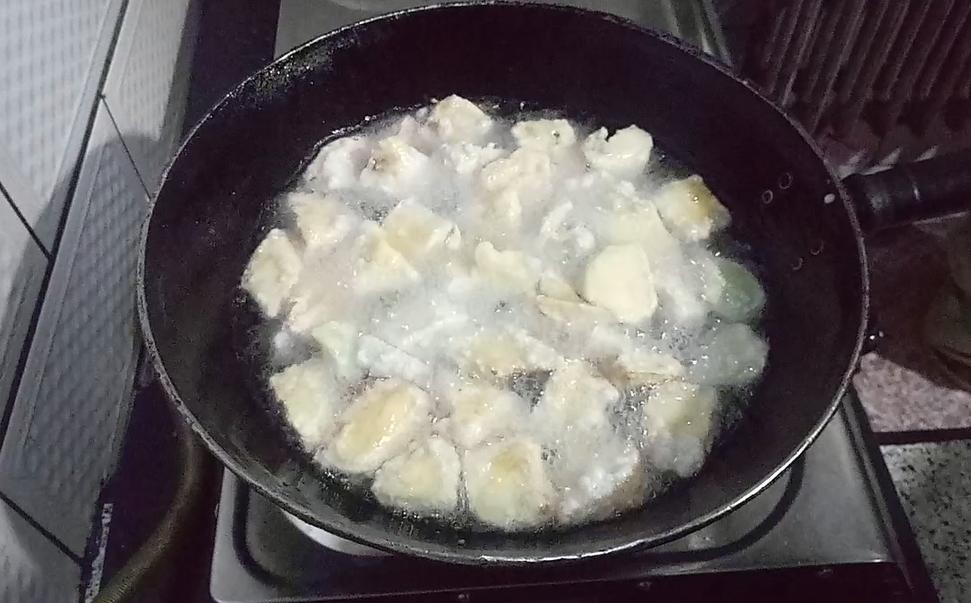 茄子块儿裹上淀粉糊后,我们就可以开始炸茄子了。热锅烧油,油温七成热之后,下茄子块儿,边炸边搅动,防止茄子块儿粘连,也可以保证茄子块儿均匀上色。当茄子的外衣炸到金黄时捞出即可。切记炸的过火,不然会影响整道菜的口感和味道。