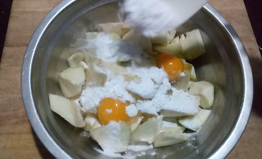 这些做好之后,我们来给茄子块裹上一层外衣。先把鸡蛋打入茄子块儿中,然后倒入两勺淀粉抓匀,让淀粉糊均匀的裹在茄子块儿上。这里需要注意,必须把茄子块儿上裹上均匀的糊,一是可以保证炸的时候,茄子块儿颜色均匀。二可以保证茄子本身吸油少,这样油糊茄子吃起来才不会腻。