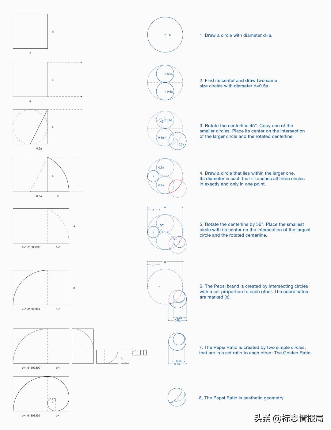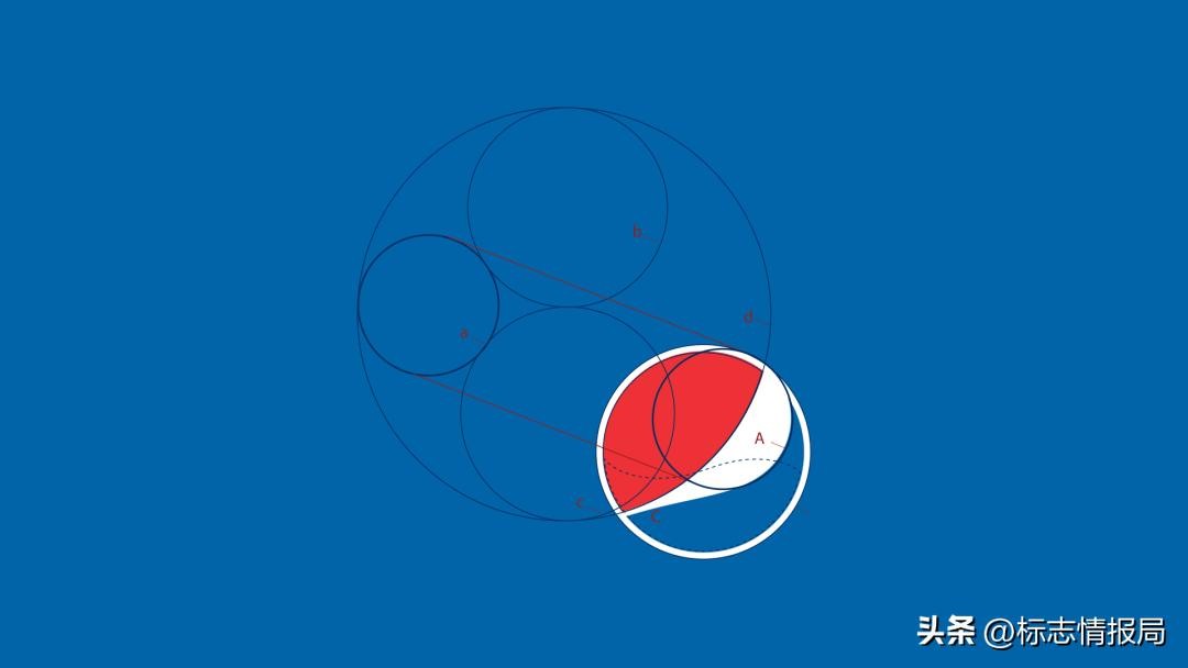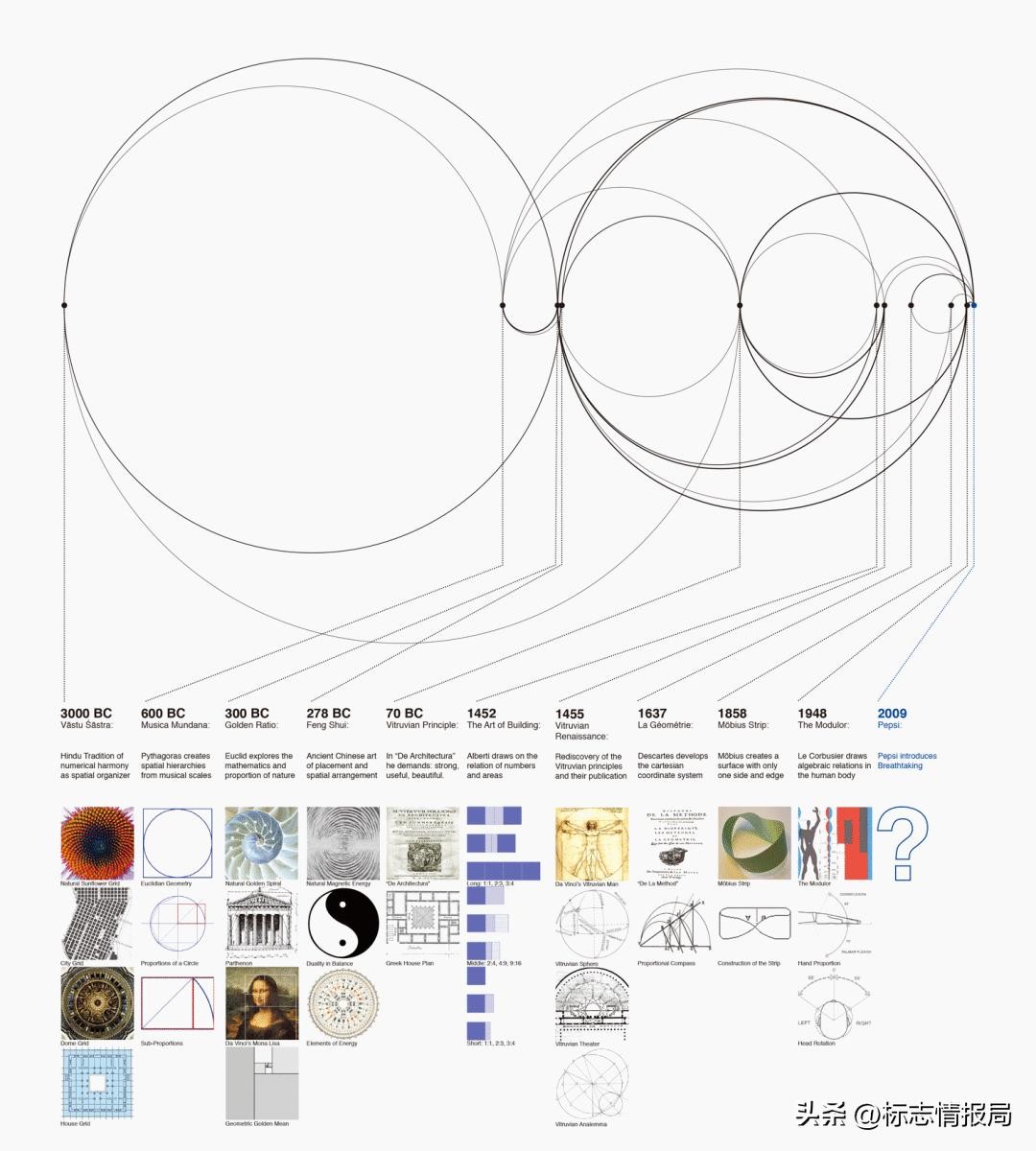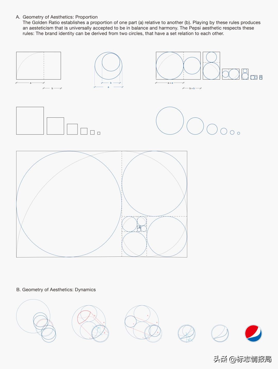 在尝试了各种设计重构后,标志的设计战略基于过去5000多年人类总结下来的设计智慧,遵循了黄金比例分割、几何学、modulor等众多数学知识和理论展开设计。比如将百事可乐底部的圆应用黄金比例「a:b = 1.618:1」,便可以制作许多这样的小圆圈,其新标志就是使用这些圆圈设计的。
