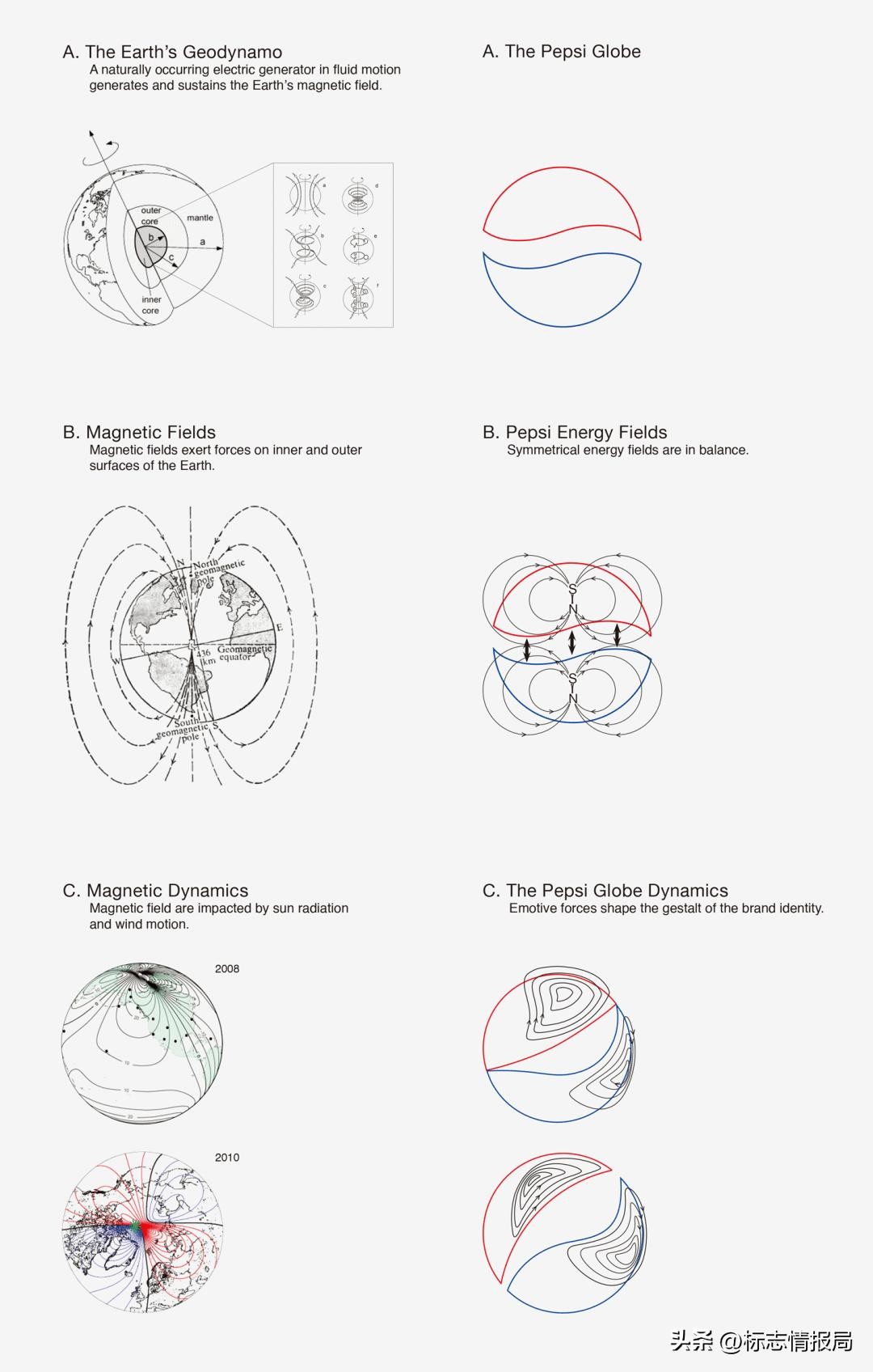 此外,百事可乐的标志还和电磁场有关。地球由于内部流体运动而产生大磁场,地球的磁场会影响太阳的热量和风的运动,而百事可乐标志会影响人的「情绪」。基于这一概念,此外,百事可乐的标志设计甚至可以根据动作和外观来表达人类的情感。