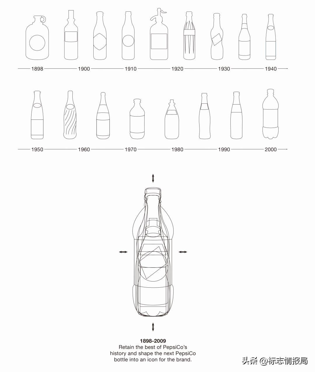 百事可乐瓶身设计也参考了自1898年百事可乐推出的第一个厚实的瓶子,再到后来慢慢演变成更细更轻便的瓶子,最终形成了现在的PET 瓶形状。有必要设计一个新的瓶子,但必须保留瓶子的精髓,这是最好的设计方法。