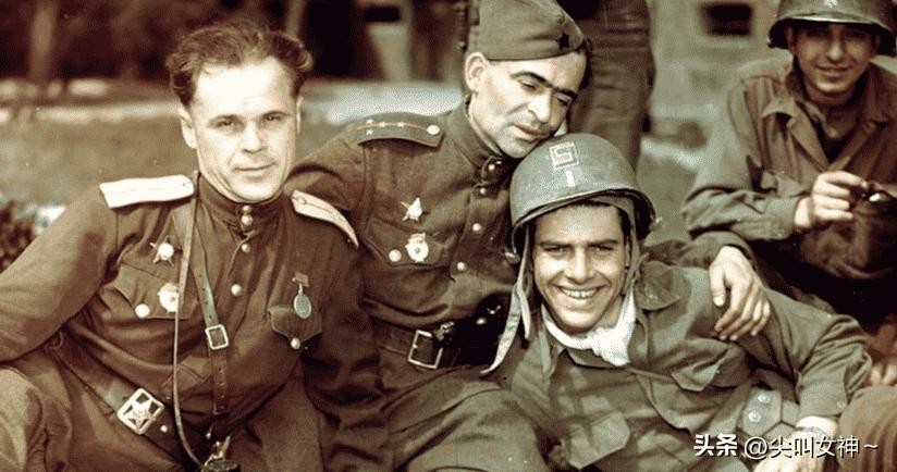 1945年,苏军和美军汇合后,两国的士兵一起坐在草坪上,享受着这短暂的静谧时光。当时两个国家有着共同的敌人,在战场上是战友。虽然他们不是来自于一个国家,但是他们有相同的目标,那就是打倒德军,还欧洲各国一个和平的环境。