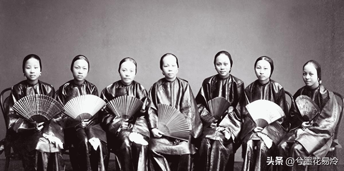 1880-1890年,七名女子在照相馆内合影。这里又要告诉大家一个知识点,清朝汉族女子缠足之风很盛,但是东南沿海的客家女子是不缠足的,照片中这些人都是天足。她们穿着从明朝流传下来的高底鞋(登云履),站起来很能突显高挑的身材。